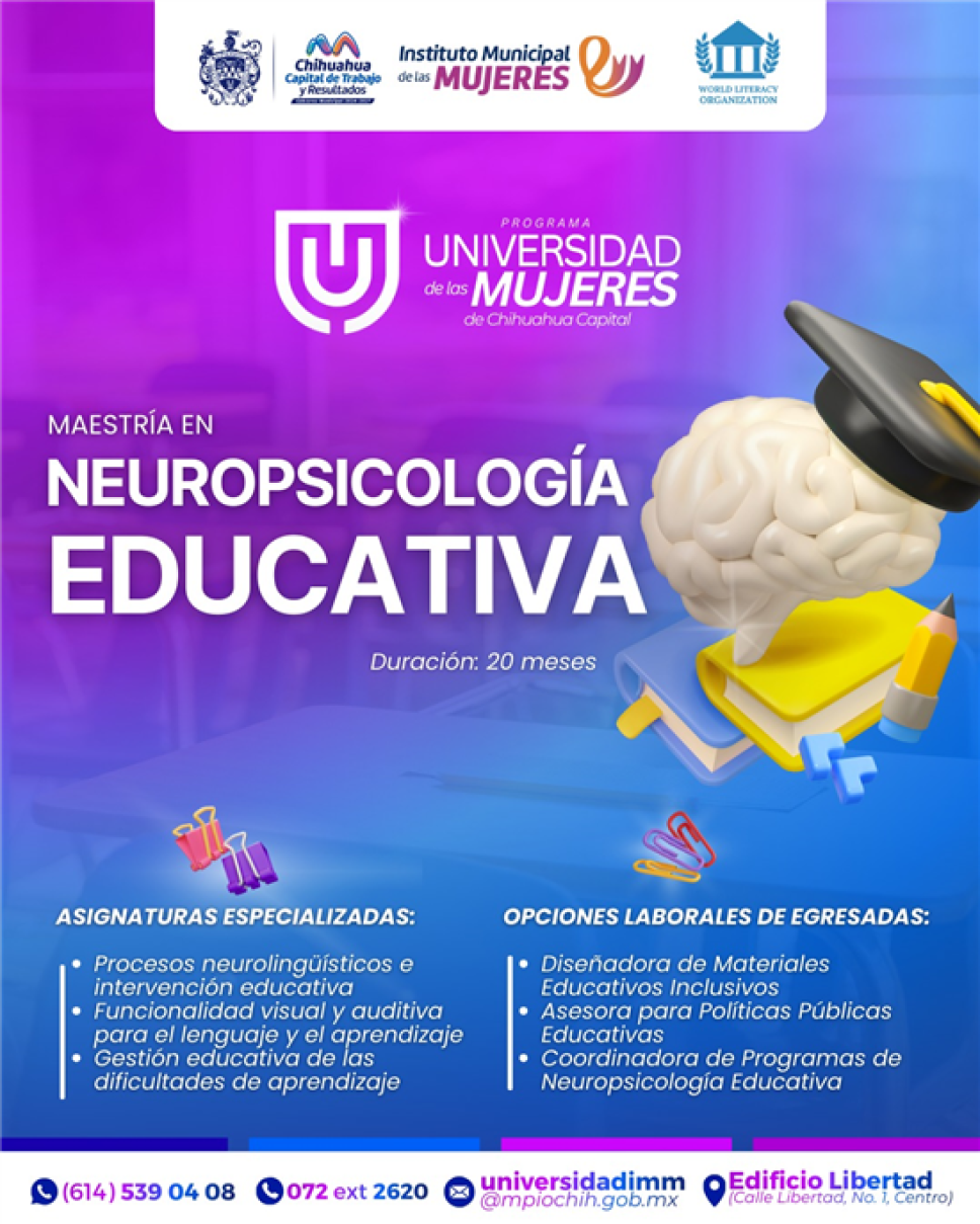 El Gobierno Municipal de Chihuahua, a través del Instituto Municipal de las Mujeres (IMM), convocó a las mujeres del estado a inscribirse en la maestría en Neuropsicología Educativa, que forma parte de la oferta académica de la Universidad de las Mujeres, la cual cuenta con becas tanto en licenciaturas como en programas de posgrado.