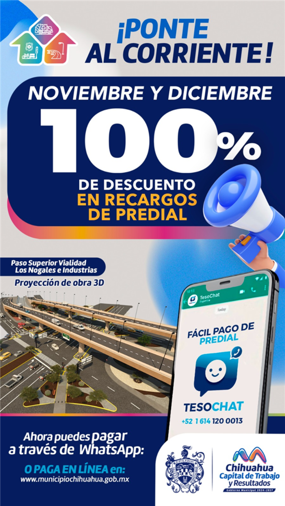 Dando un salto a la digitalización de trámites, el Gobierno Municipal, a través de la Tesorería, ha puesto en marcha el TesoChat, un nuevo servicio vía WhatsApp que facilita a los ciudadanos el pago de su Predial sin salir de casa u oficina. Los contribuyentes podrán aprovechar el atractivo descuento del 100% en multas y recargos durante los meses de noviembre y diciembre.
