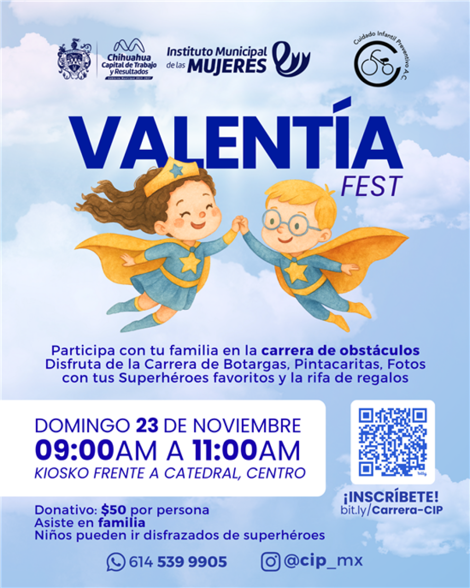 La diversión familiar y la prevención de la violencia se darán la mano este mes. El Gobierno Municipal de Chihuahua, en colaboración con Cuidado Infantil Preventivo A.C., invita a todas las familias a participar en el "Valentía Fest", un evento lúdico con causa que se celebrará el próximo domingo 23 de noviembre en el Centro Histórico.
