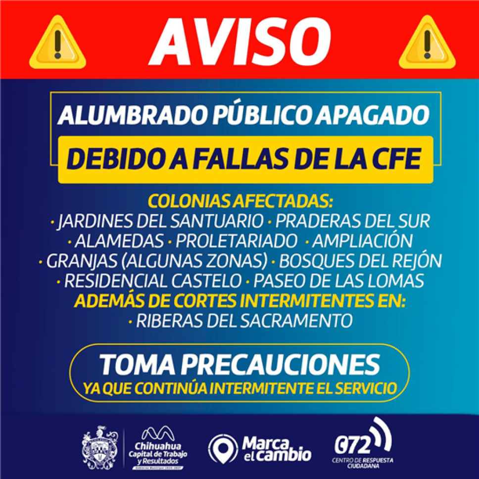 Fallas en la CFE afectan el alumbrado público en distintos sectores de Chihuahua.