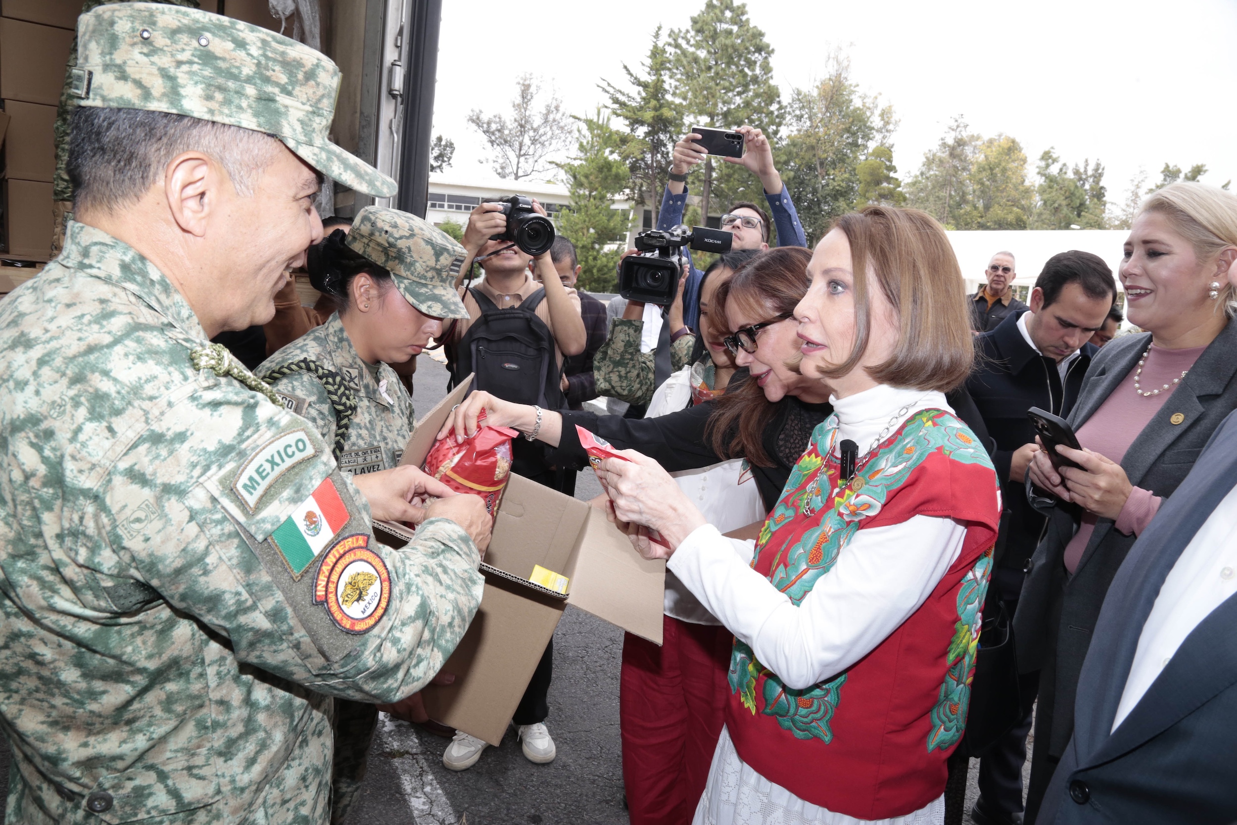 La presidenta de la Cámara de Senadores, Laura Itzel Castillo Juárez, informó que seis de los tráileres se entregaron en el Campo Militar Número 1 y cuatro más en el Aeropuerto de Pachuca, Hidalgo. Adicionalmente, anunció que entre el domingo y el próximo lunes se entregarán 80 mil despensas más, recaudadas gracias a la generosidad de senadores, trabajadores del recinto parlamentario y la ciudadanía.