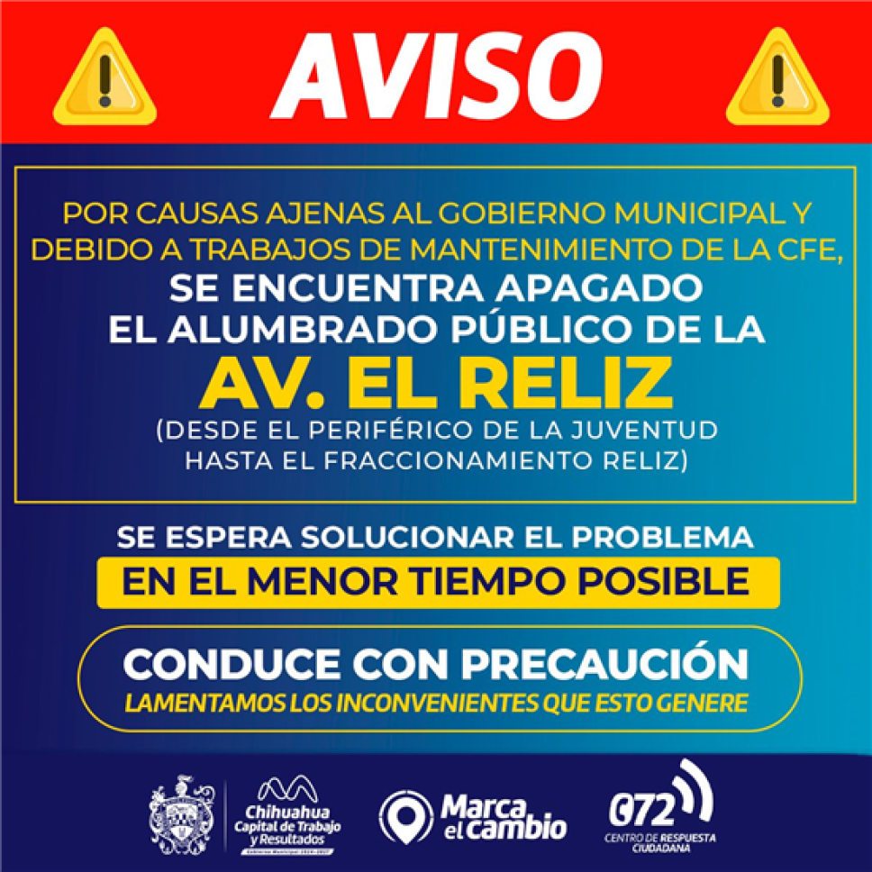 El Gobierno Municipal informó que, debido a trabajos de adecuación y mantenimiento realizados por la Comisión Federal de Electricidad (CFE), el alumbrado público permanece apagado en la Zona Reliz, en el tramo comprendido entre el Periférico de la Juventud y el parque El Reliz.