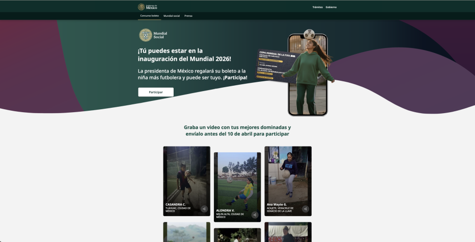 El sitio destaca el concurso "Representa a México en la Inauguración del Mundial", dirigido a mujeres de entre 16 y 25 años que demuestren su destreza con las "dominadas". La ganadora recibirá el simbólico Boleto 0001 de manos de la Presidenta Claudia Sheinbaum Pardo, asegurando su lugar en el partido inaugural entre México y Sudáfrica el próximo 11 de junio en el Estadio Azteca.