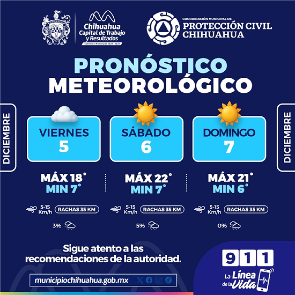 La Coordinación Municipal de Protección Civil anunció que, del 5 al 7 de diciembre, se mantendrán las mañanas frías en la capital, con temperaturas más templadas por la tarde y presencia de ráfagas moderadas de viento.