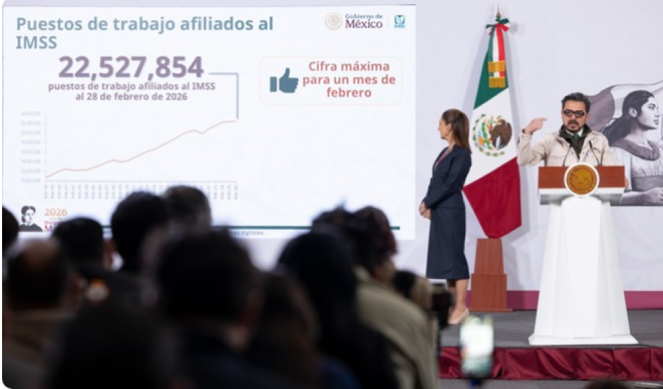 La presidenta de México, Claudia Sheinbaum Pardo, informó que al 28 de febrero de 2026 se registraron 22 millones 527 mil 854 puestos de trabajo afiliados al Instituto Mexicano del Seguro Social (IMSS), cifra máxima para un mes de febrero y la quinta más alta en la historia del país.