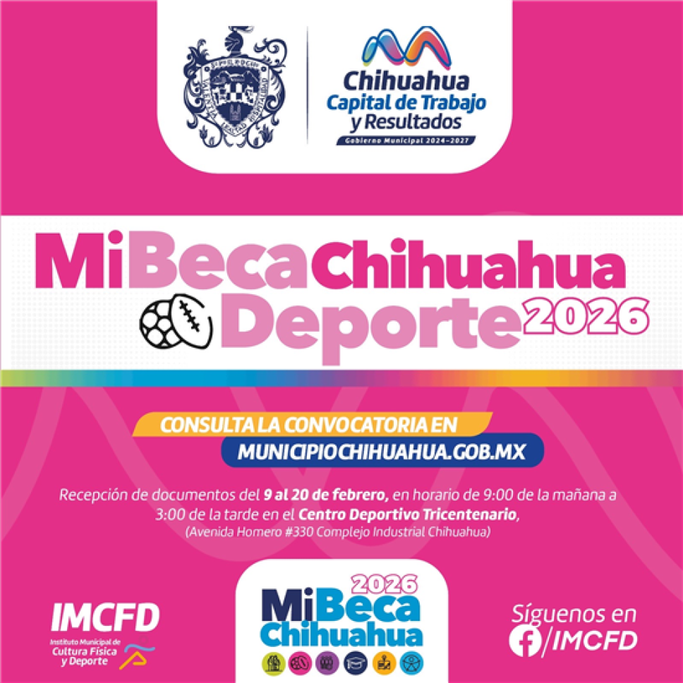 El Gobierno Municipal de Chihuahua, a través del Instituto Municipal de Cultura Física y Deporte (IMCFD), anunció la apertura del período de recepción de documentos para el programa “Mi Beca Chihuahua del Deporte 2026”, que se llevará a cabo del lunes 9 al viernes 20 de febrero. Esta iniciativa busca brindar apoyo económico a deportistas, entrenadores, promotores en cancha y comités deportivos, reconociendo su desempeño y esfuerzo en la actividad física y competitiva.