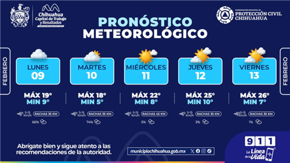 La Coordinación Municipal de Protección Civil informó que durante el inicio de esta semana se prevén lluvias y condiciones nubladas, principalmente lunes 9 y martes 10 de febrero, por lo que exhorta a la población a extremar precauciones al conducir y evitar accidentes.
