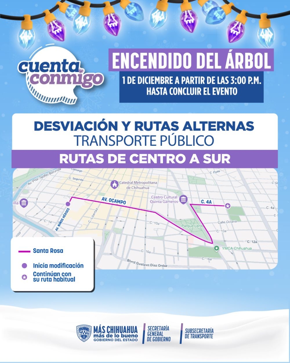 Anuncian desvíos temporales en rutas de transporte por el Encendido del Árbol Navideño 2025.