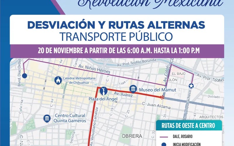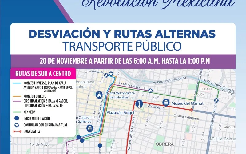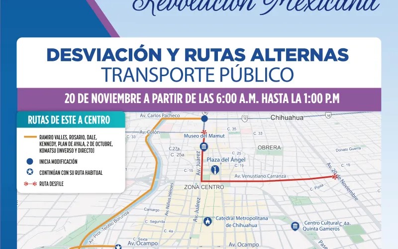 Con motivo del tradicional desfile cívico-militar del 20 de noviembre, la Secretaría General de Gobierno, a través de la Subsecretaría de Transporte, anunció cierres viales en las avenidas principales del centro de la ciudad de Chihuahua, lo que implicará modificaciones temporales en diversas rutas del servicio de Transporte Colectivo Urbano.