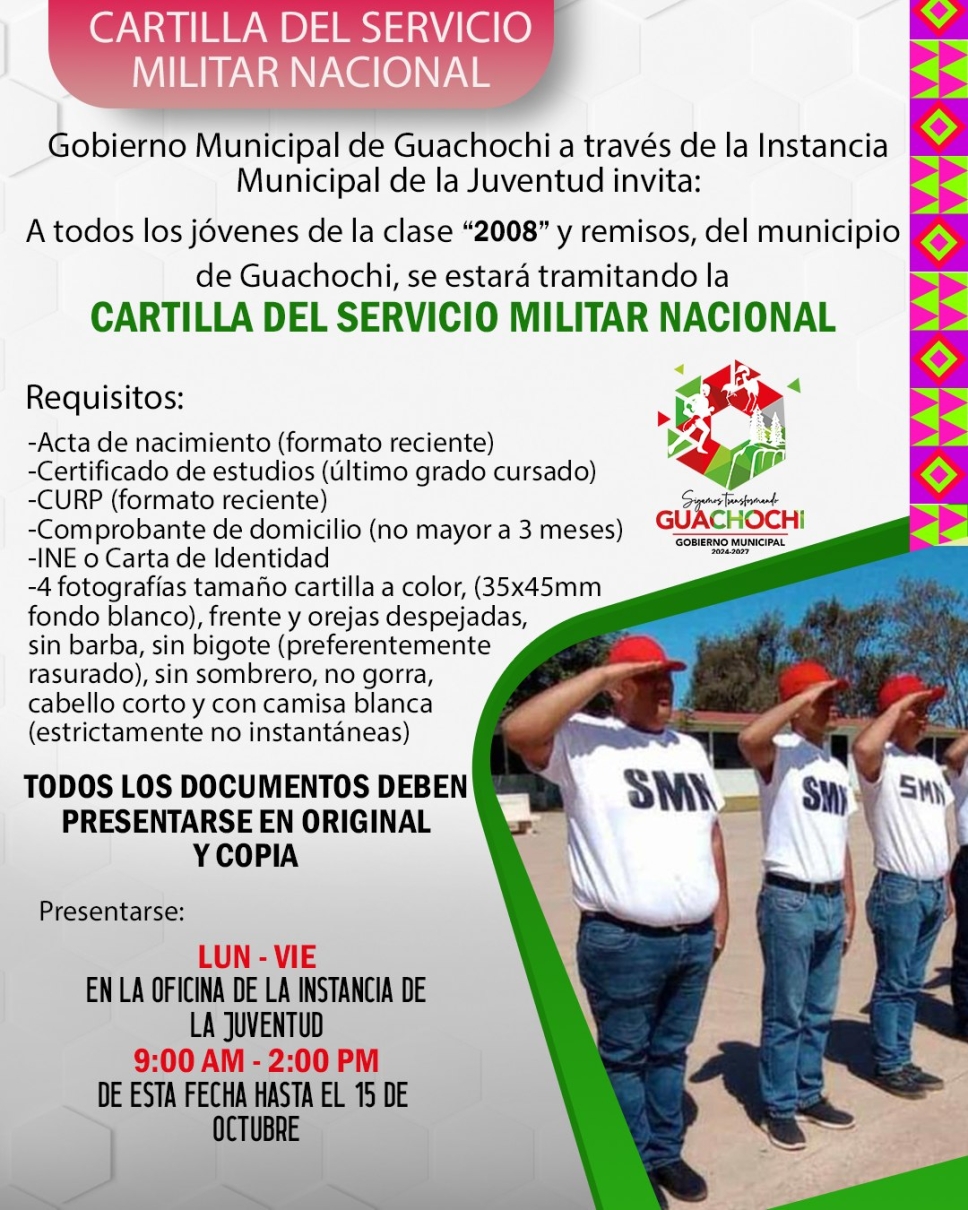 El Gobierno Municipal de Guachochi hace un llamado oficial a los jóvenes en edad militar y remisos para que inicien su proceso de registro y obtención de la Cartilla del Servicio Militar Nacional.