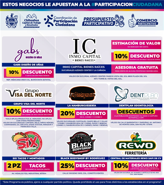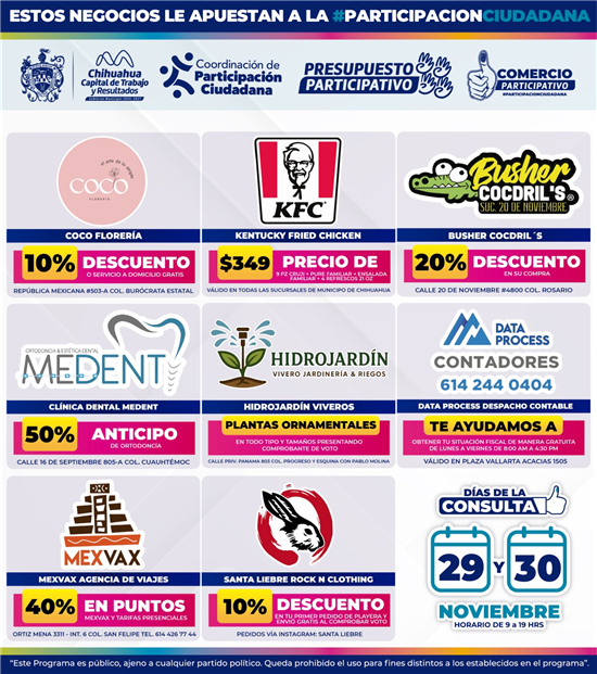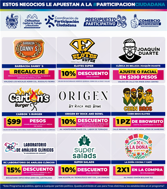 El Gobierno Municipal anunció que un total de 26 negocios de la ciudad se sumaron a la dinámica del Presupuesto Participativo 2026, con la finalidad de incentivar la participación en la jornada de votación. Los comercios otorgarán beneficios y descuentos exclusivamente durante los días en que se realice la consulta.