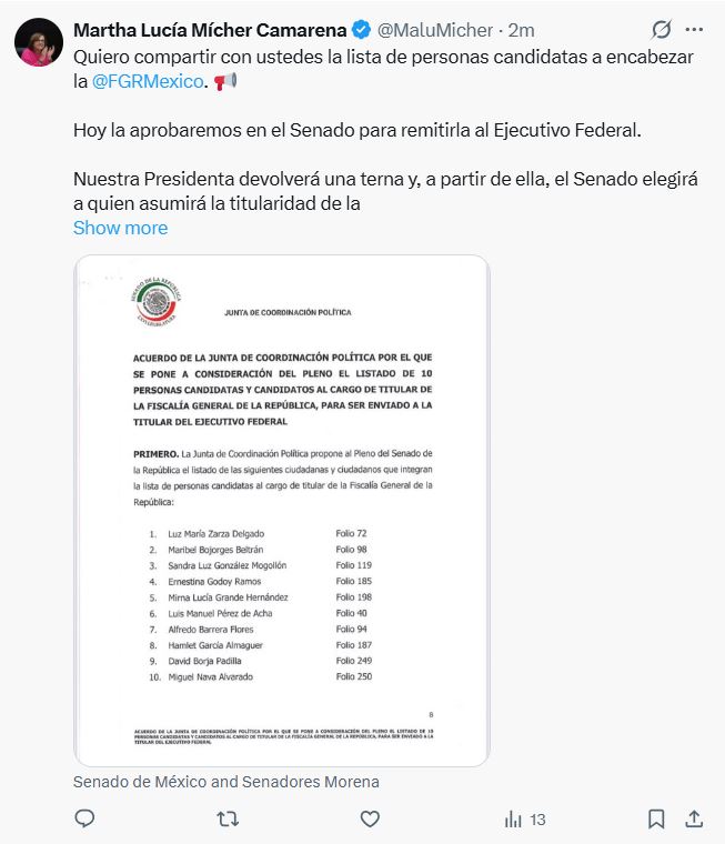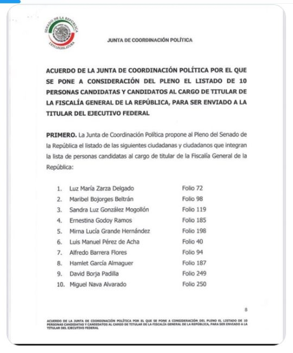 Una vez avalado, dicho documento será remitido al Ejecutivo Federal, quien deberá retornar una terna. Posteriormente, el Senado realizará la elección final para definir a la persona que asumirá la titularidad de la Fiscalía General del país.
