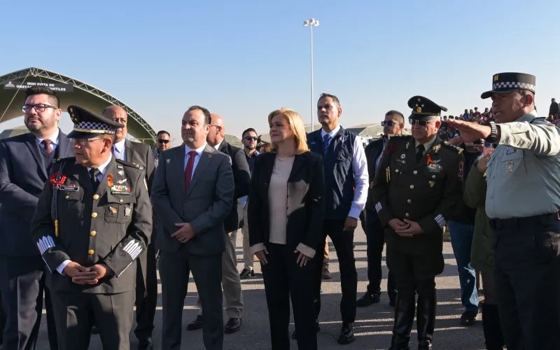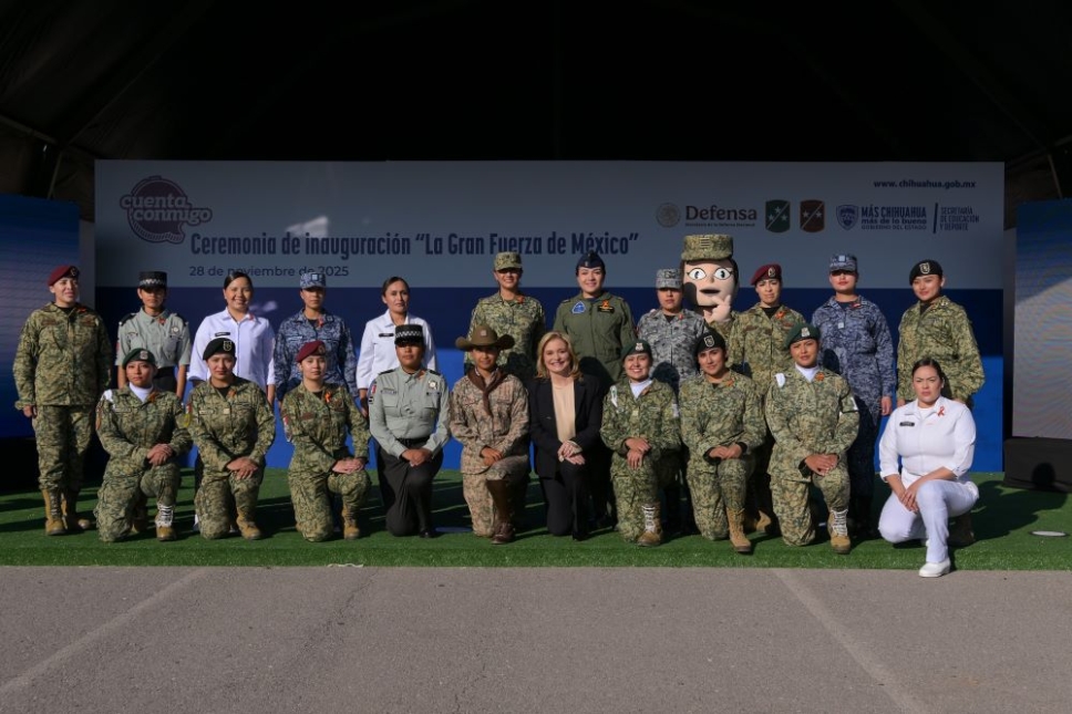 La gobernadora Maru Campos asistió como invitada de honor al arranque de la exposición militar “La Gran Fuerza de México”, organizada por la Secretaría de la Defensa Nacional (Sedena) en la Explanada de la Feria de Santa Rita, donde se exhibe el equipo, vehículos y funciones de diversas áreas del Ejército y Fuerza Aérea.