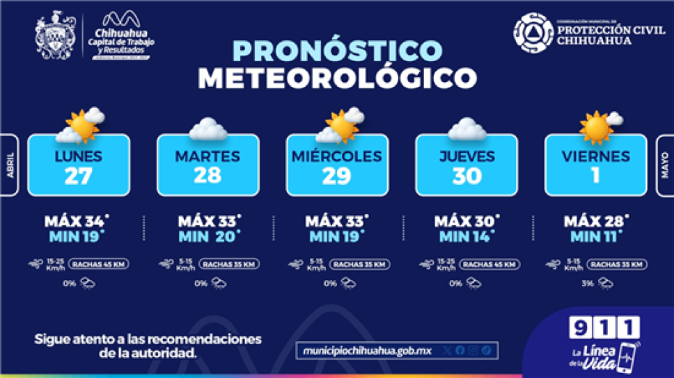 Chihuahua alcanzará los 34°C este lunes. Protección Civil emite alerta por altas temperaturas y viento.