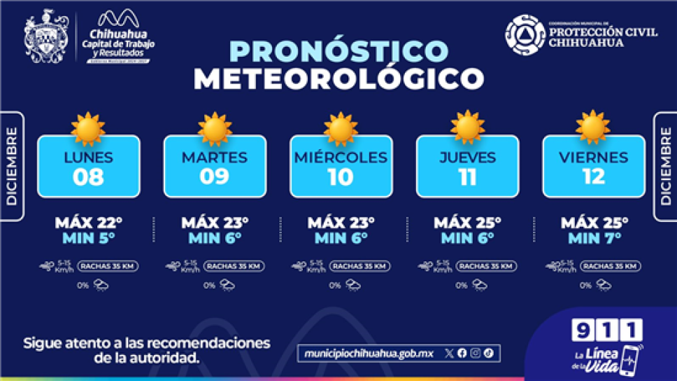 El jueves 11 se anticipa un ligero incremento en la temperatura, alcanzando una máxima de 25°C y mínima de 6°C, mientras que el viernes 12 repetirá una máxima de 25°C y mínima de 7°C, acompañado de vientos moderados.