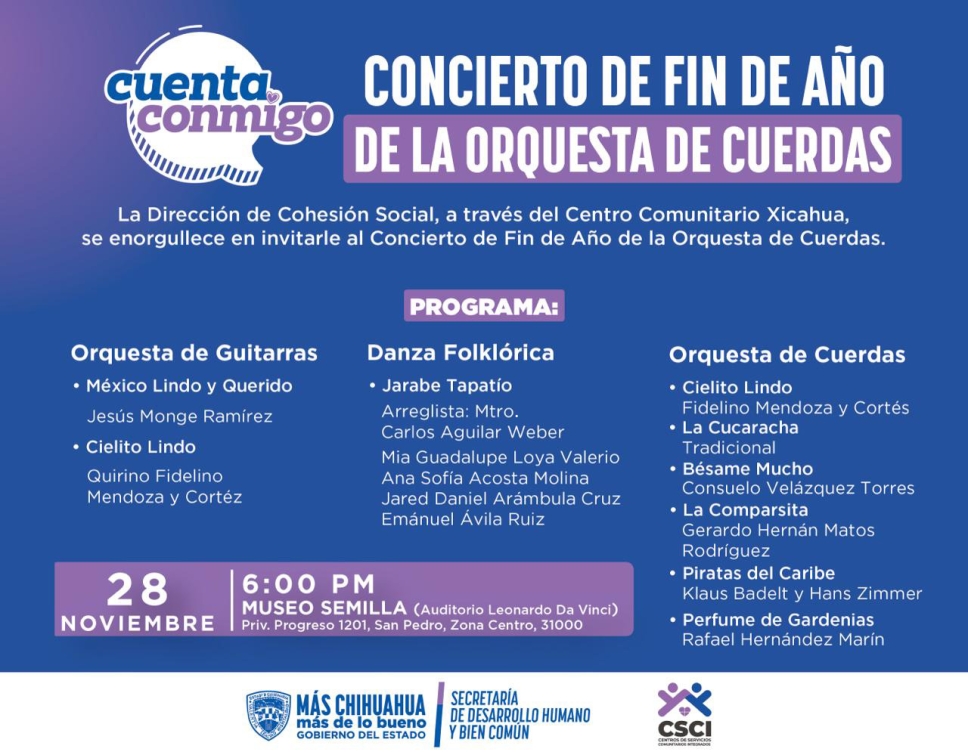 El Gobierno del Estado, mediante la Secretaría de Desarrollo Humano y Bien Común, invitó a la comunidad al Concierto de Fin de Año que presentará la Orquesta de Cuerdas del Centro Comunitario Xicahua, donde estudiantes compartirán su talento en una tarde llena de música y alegría.