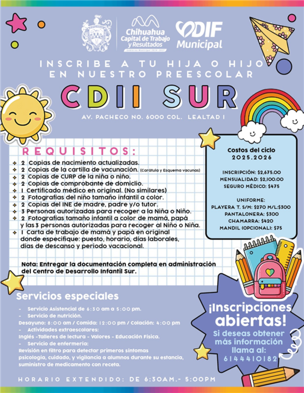 Con el objetivo de garantizar una educación de calidad desde la primera infancia, el DIF Municipal invita a las familias chihuahuenses a inscribir a sus niños en los Centros de Desarrollo Infantil (CDI). Estos planteles, ubicados en las colonias Revolución (Norte) y Lealtad I (Sur), operan bajo estándares oficiales de la Secretaría de Educación y Deporte, ofreciendo un entorno formativo de excelencia. Lo que distingue a estos centros es su enfoque integral: los alumnos no solo cursan su preescolar, sino que acceden a clases de inglés, educación física y un programa de nutrición completo que incluye tres alimentos al día. Pensando en la dinámica de las familias actuales, el servicio se ofrece en un horario extendido de 6:30 a 17:00 horas, contando además con apoyo psicológico, enfermería y formación en valores. Para este ciclo, se han establecido cuotas competitivas que incluyen seguro médico, reafirmando el compromiso de la administración del alcalde con el bienestar de los más pequeños y la tranquilidad de sus padres. Los interesados pueden acudir directamente a las oficinas del DIF en San Felipe o comunicarse a las líneas de atención para asegurar un lugar en estos espacios de vanguardia educativa.