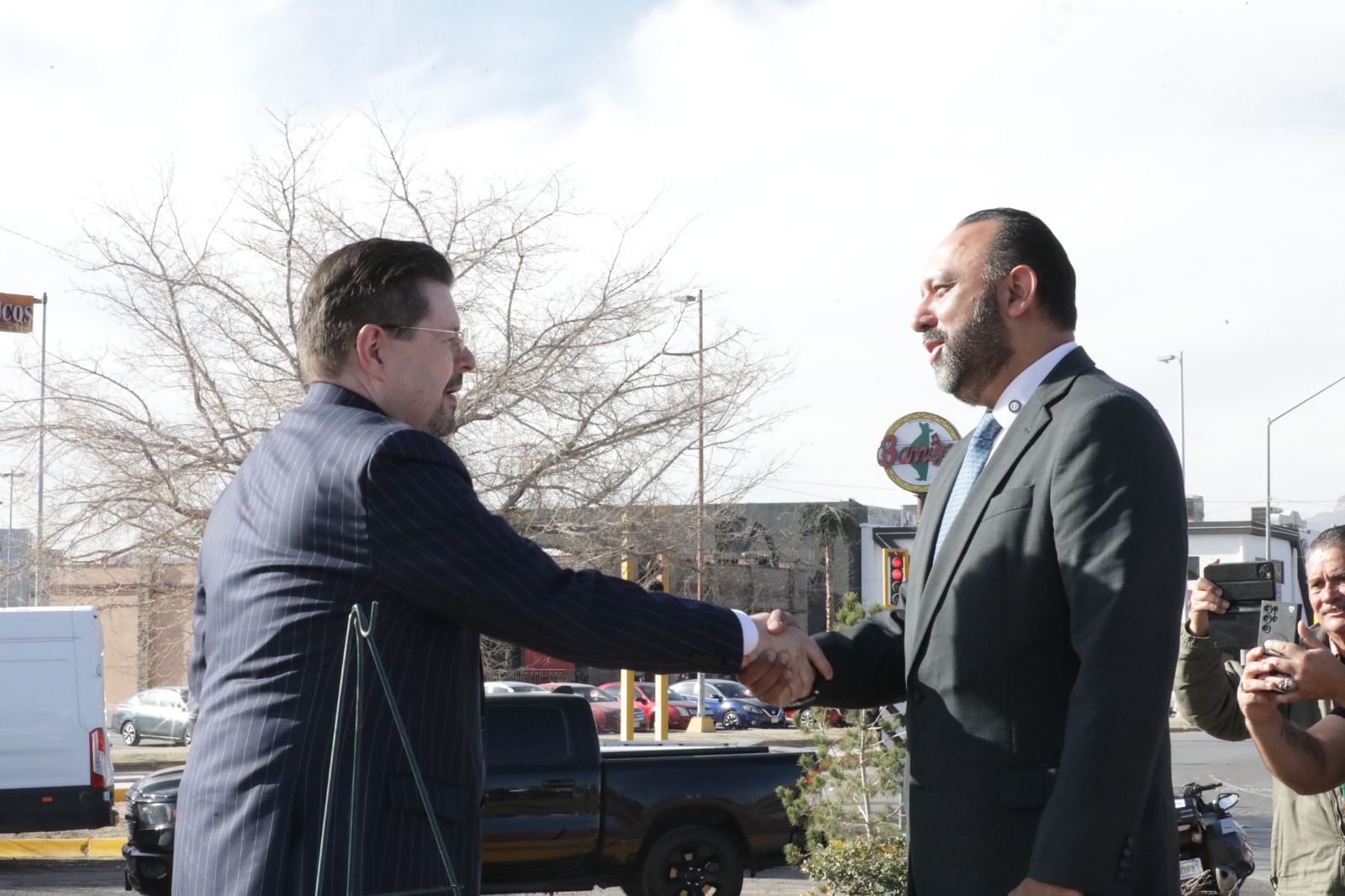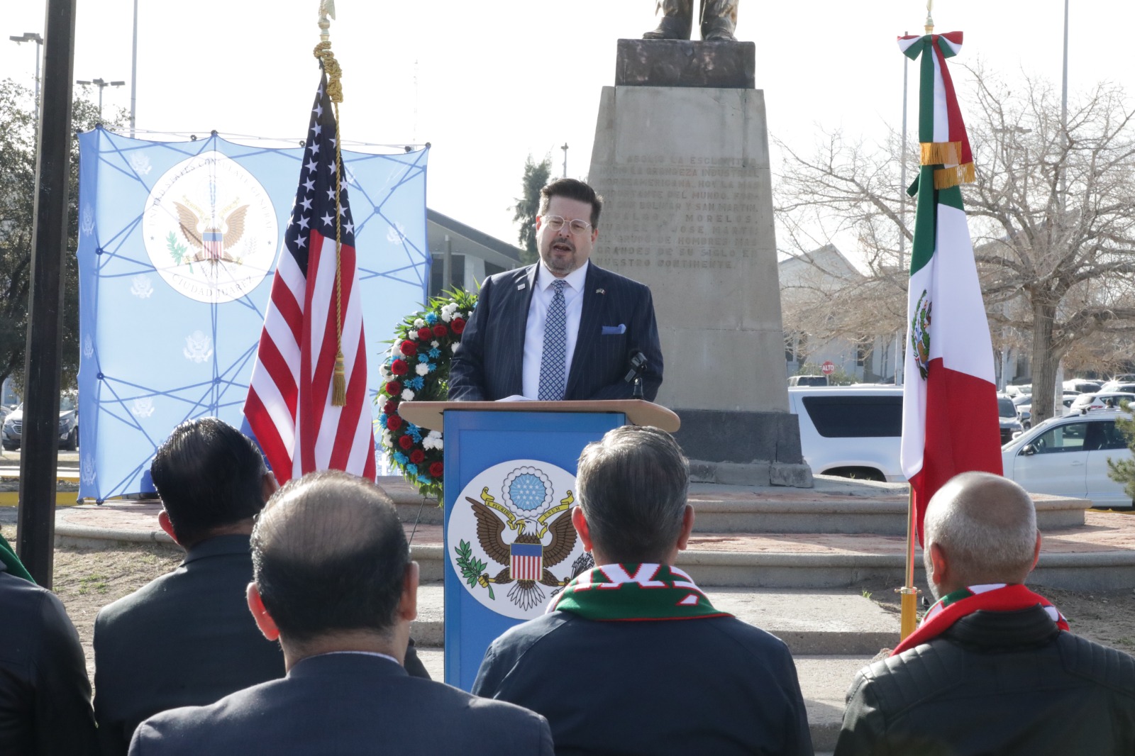 El funcionario felicitó al Consulado por llevar a cabo esta primera ceremonia del Día de los Presidentes en la frontera y reiteró que el Gobierno Municipal mantendrá coordinación permanente con la representación diplomática para impulsar acciones conjuntas que fortalezcan el desarrollo y la cooperación binacional en beneficio de la comunidad juarense.