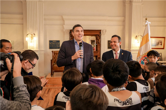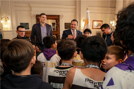 Niños y jóvenes deportistas de equipos representativos de Chihuahua fueron recibidos en la Presidencia Municipal por el alcalde Marco Bonilla, quien les preparó una sorpresa especial: la visita del ex jugador de la NBA, el chihuahuense Eduardo Nájera.