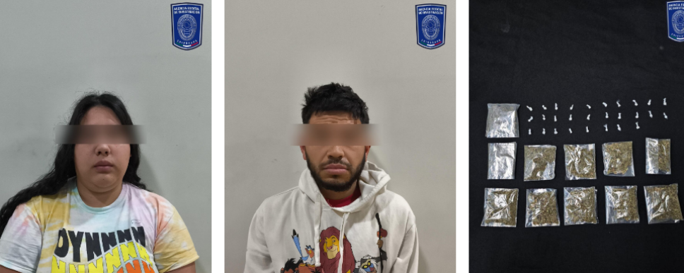 Elementos de la Agencia Estatal de Investigación, adscritos al Centro de Operaciones Estratégicas de la Zona Norte, concretaron la detención de Paola O. P. e Israel Aron M. V. en la intersección de las calles Encino y Amapolas. Durante la revisión de seguridad, los agentes aseguraron 28 envoltorios de plástico que contenían una sustancia química con las características de la cocaína en piedra, con un peso aproximado de cuatro gramos, además de 11 envoltorios adicionales con hierba verde y olorosa, identificada preliminarmente como marihuana, la cual dio un peso de 104 gramos.