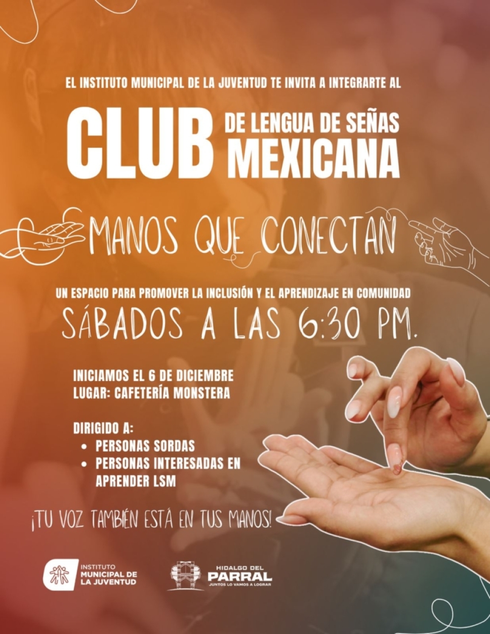 El Gobierno de Parral, a través del Instituto Municipal de la Juventud (IMJUVE), anunció la puesta en marcha del Club de Lengua de Señas Mexicana (LSM) “Manos que Conectan”, un espacio diseñado para fomentar el aprendizaje práctico, la convivencia y la inclusión de personas sordas y de cualquier ciudadano interesado en desarrollar esta forma de comunicación.