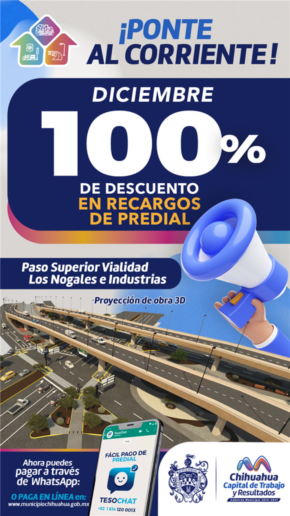 Las y los contribuyentes pueden realizar su pago en línea a través de www.municipiochihuahua.gob.mx o mediante el TesoChat, vía WhatsApp, al 614 120 00 13. Los pagos con tarjeta están disponibles a 3 y 6 meses sin intereses, tanto de manera presencial como digital.