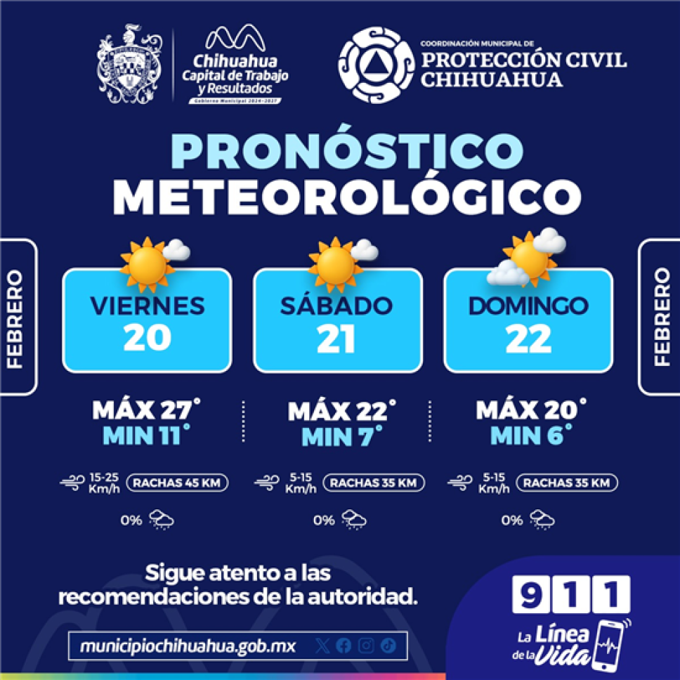 La Coordinación Municipal de Protección Civil informó que, de acuerdo con el Servicio Meteorológico Nacional, la capital del estado enfrentará condiciones climáticas variables durante este fin de semana. Para este viernes, se prevé una temperatura máxima de 27°C, sin embargo, la principal amenaza serán las rachas de viento que podrían superar los 45 kilómetros por hora, lo que representa un riesgo para objetos ligeros en techos y vía pública.