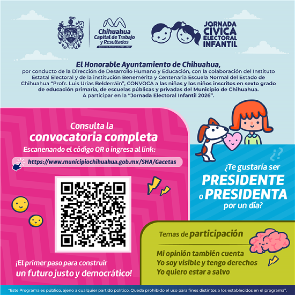 El Gobierno Municipal de Chihuahua, a través de la Dirección de Desarrollo Humano y Educación, convocó a alumnas y alumnos de sexto grado de primaria, de escuelas públicas y privadas del municipio, a participar en la Jornada Cívica Electoral Infantil 2026, en el marco de la celebración del Día de la Niñez.