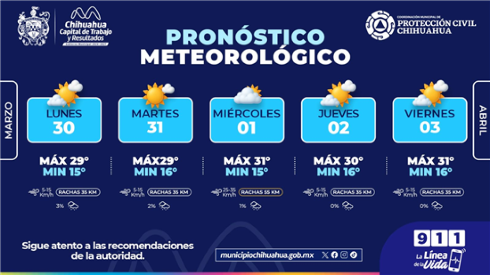 El comportamiento del clima para los próximos días muestra una tendencia al alza; mientras que este lunes y martes se mantienen en los 29°C, a partir del miércoles 1 de abril el termómetro escalará hasta los 31°C, manteniendo una mínima constante de 15°C por las noches. Para el jueves y viernes santo, se prevén cielos parcialmente nublados con máximas de 30°C y 31°C respectivamente, lo que generará un ambiente sofocante para quienes asistan a eventos religiosos o centros recreativos. Ante este panorama, Protección Civil hace un llamado enérgico a no bajar la guardia, especialmente ante las rachas de viento que suelen presentarse en la región y que podrían complicar la estancia en exteriores.