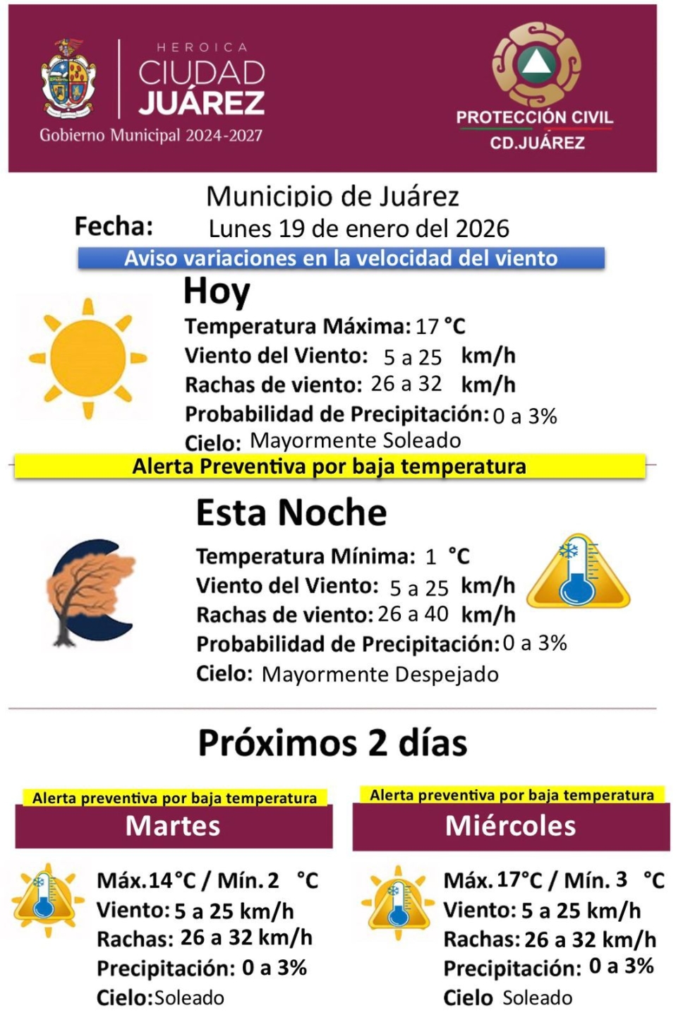 La Dirección General de Protección Civil de Ciudad Juárez emitió una alerta preventiva para este lunes 19 de enero debido a un marcado descenso en las temperaturas y la presencia de ráfagas de viento. Aunque se espera una tarde mayormente soleada con una máxima de 17°C, el termómetro caerá drásticamente durante la noche hasta alcanzar apenas 1°C, con una sensación térmica que podría ser menor debido a vientos que alcanzarán los 40 kilómetros por hora.