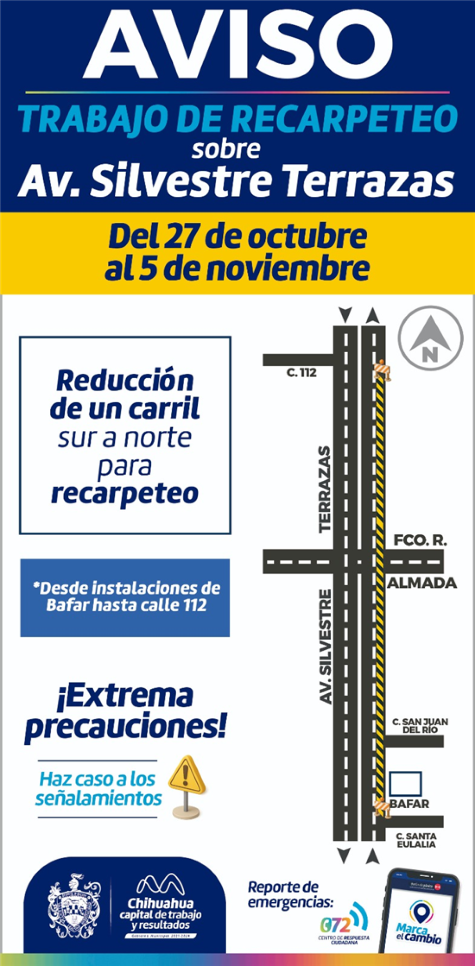 Las obras comenzarán este próximo lunes 27 de octubre a partir de las 8:00 de la mañana y se concentrarán en el tramo de la Carretera a Cuauhtémoc-Silvestre Terrazas.