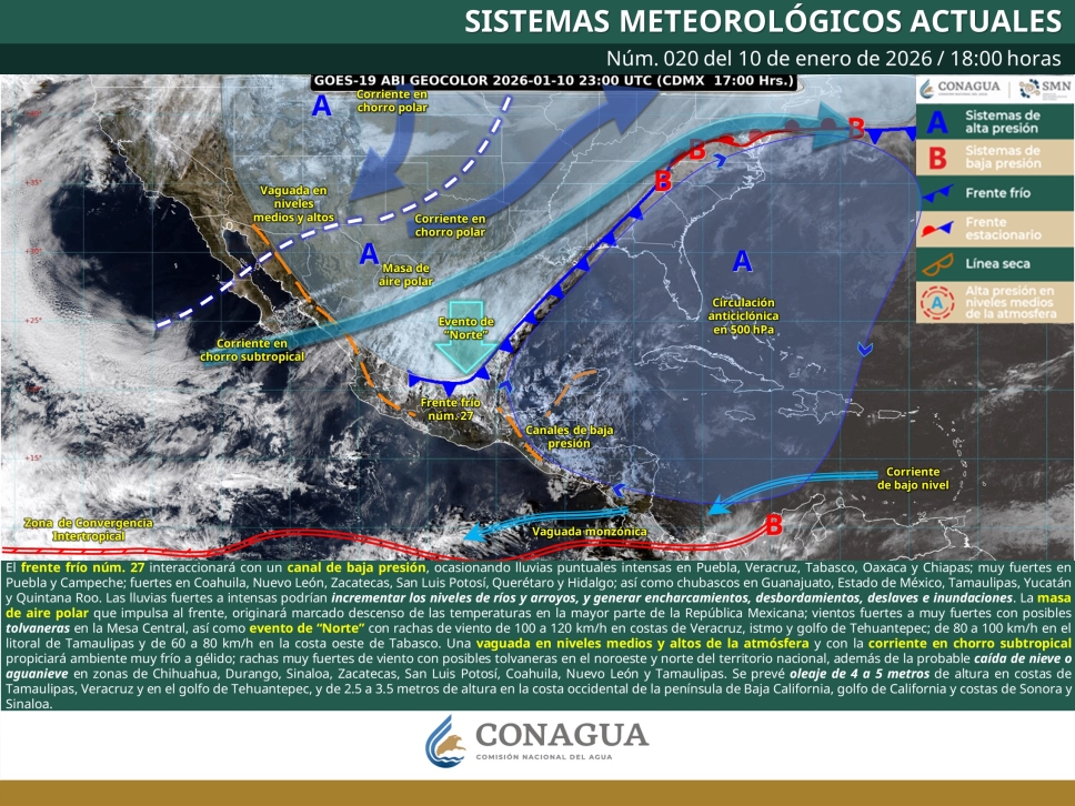 Alertan por impacto simultáneo de frente frío 27 y tormenta invernal en el país.