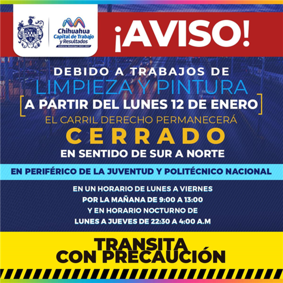 Los trabajos se desarrollarán en dos turnos: de lunes a viernes, en un horario de 9:00 a 13:00 horas, y de lunes a jueves durante la noche, de 22:30 a 4:00 horas. Durante estos periodos se mantendrá el cierre parcial de la circulación, por lo que se recomienda a los automovilistas extremar precauciones.