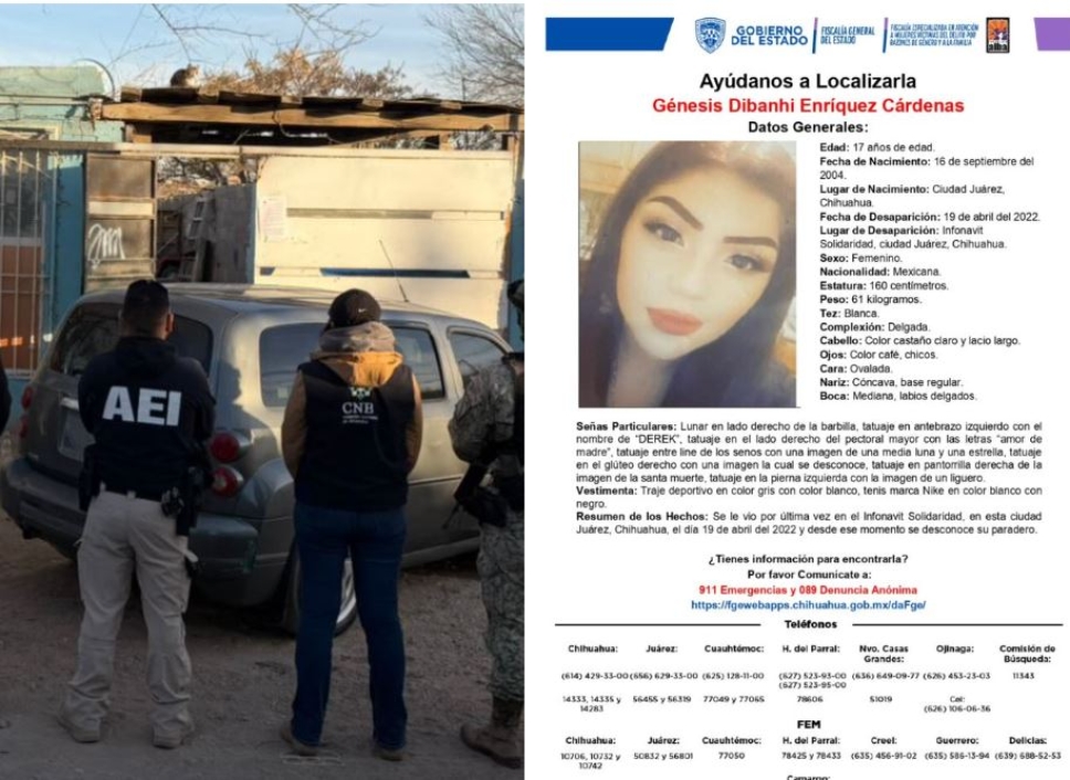 En seguimiento a la búsqueda de Génesis Dibanhi Enríquez Cárdenas, la Fiscalía Especializada en Atención a Mujeres Víctimas del Delito por Razones de Género y a la Familia (FEM), Zona Norte, cumplimentó una orden de cateo en un domicilio ubicado en la calle 2 de Octubre, en la colonia Universidad, en Ciudad Juárez.