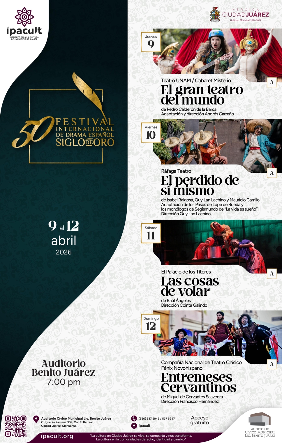 Ciudad Juárez, 2 abril 2026.– El Instituto para la Cultura del Municipio de Juárez anunció la realización del 50 Festival Internacional de Drama Español del Siglo de Oro, que se llevará a cabo del 9 al 12 de abril en el Auditorio Cívico Municipal Lic. Benito Juárez, con funciones gratuitas dirigidas al público en general.
