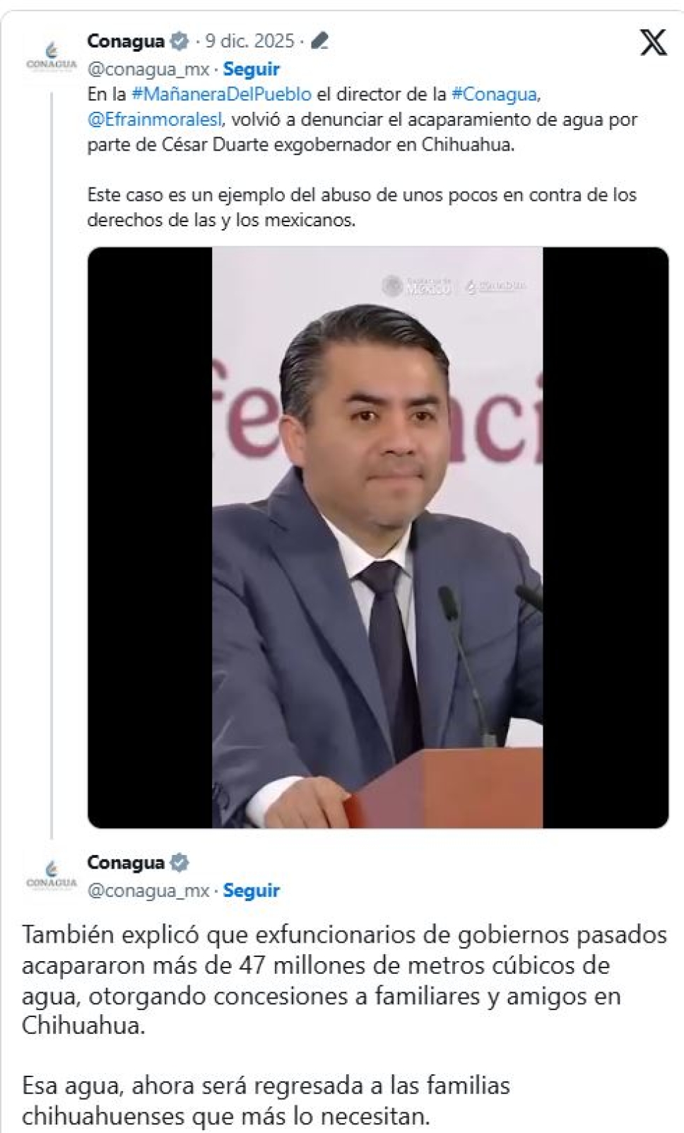 Morales señaló que este caso forma parte de una revisión más amplia en Chihuahua, una de las entidades con mayor estrés hídrico del país. Recordó además que existen antecedentes similares, como la presa construida por el exgobernador César Duarte, que retenía cerca de 700 mil metros cúbicos y afectó a numerosas comunidades aguas abajo. Dicha obra ya fue demolida por orden judicial y la denuncia correspondiente sigue su curso.