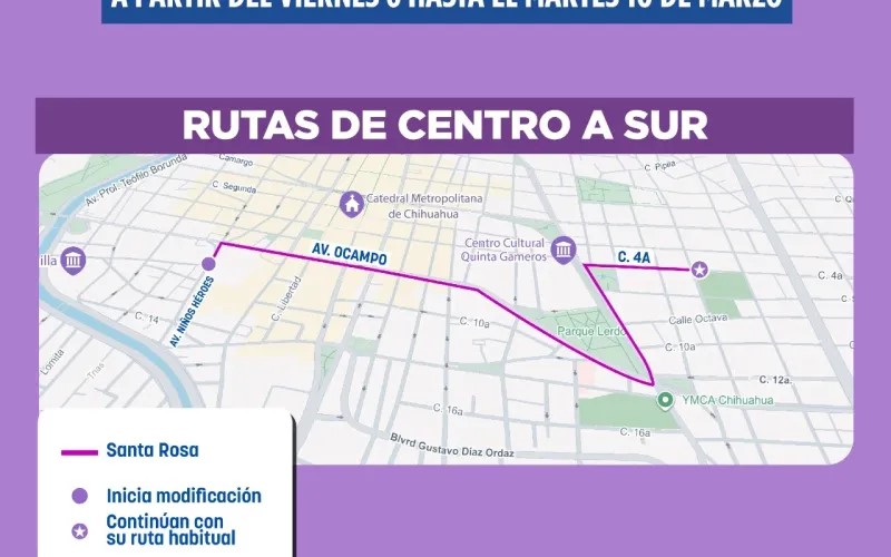 La Secretaría General de Gobierno, a través de la Subsecretaría de Transporte, anunció modificaciones temporales en los recorridos de diversas rutas de transporte colectivo que circulan por el centro de Chihuahua. Estos cambios operarán desde las 6:00 a. m. del viernes 6 de marzo hasta las 6:00 a. m. del martes 10 de marzo, con motivo de la marcha por el Día Internacional de la Mujer.