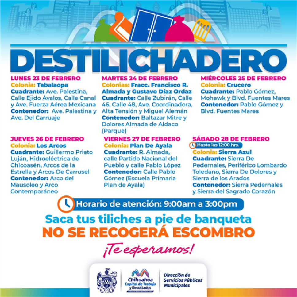 El programa de destilichadero arrancó este lunes en la colonia Tabalaopa y se extenderá hasta el próximo sábado en la colonia Sierra Azul, con el fin de retirar desechos que el camión recolector convencional no puede trasladar. La estrategia incluye la colocación de un contenedor fijo en un horario de 9:00 am a 3:00 pm de lunes a viernes, y el sábado hasta el mediodía. Además, unidades con perifoneo recorrerán los cuadrantes para recolectar los tiliches directamente al pie de banqueta.