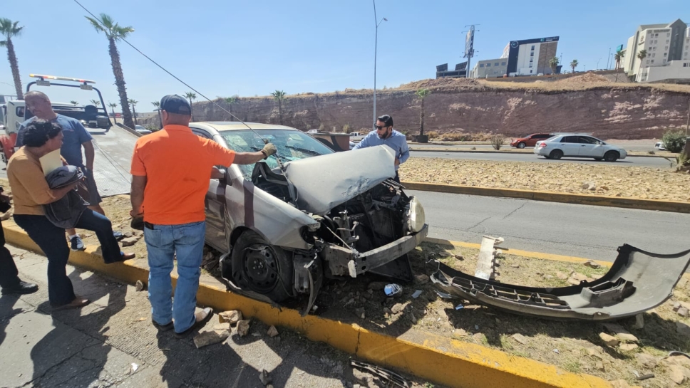 Tras el golpe, el vehículo de la responsable no se detuvo; brincó el camellón de la lateral, pasó milagrosamente entre dos palmeras y terminó su carrera estrellándose contra la retenida de un poste de la CFE.