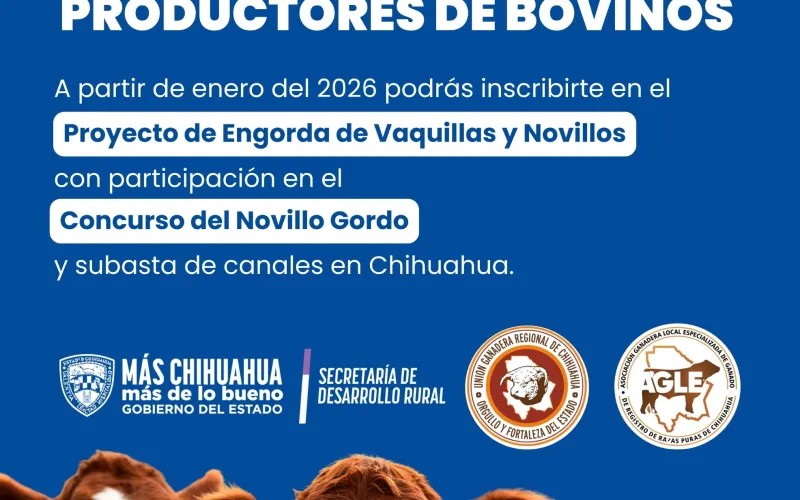 La Secretaría de Desarrollo Rural (SDR) del Gobierno del Estado de Chihuahua informó que durante la primera semana de enero se lanzará la convocatoria para participar en el proyecto de engorda de vaquillas y novillos, el cual concluirá con la subasta de canales como alternativa de comercialización.