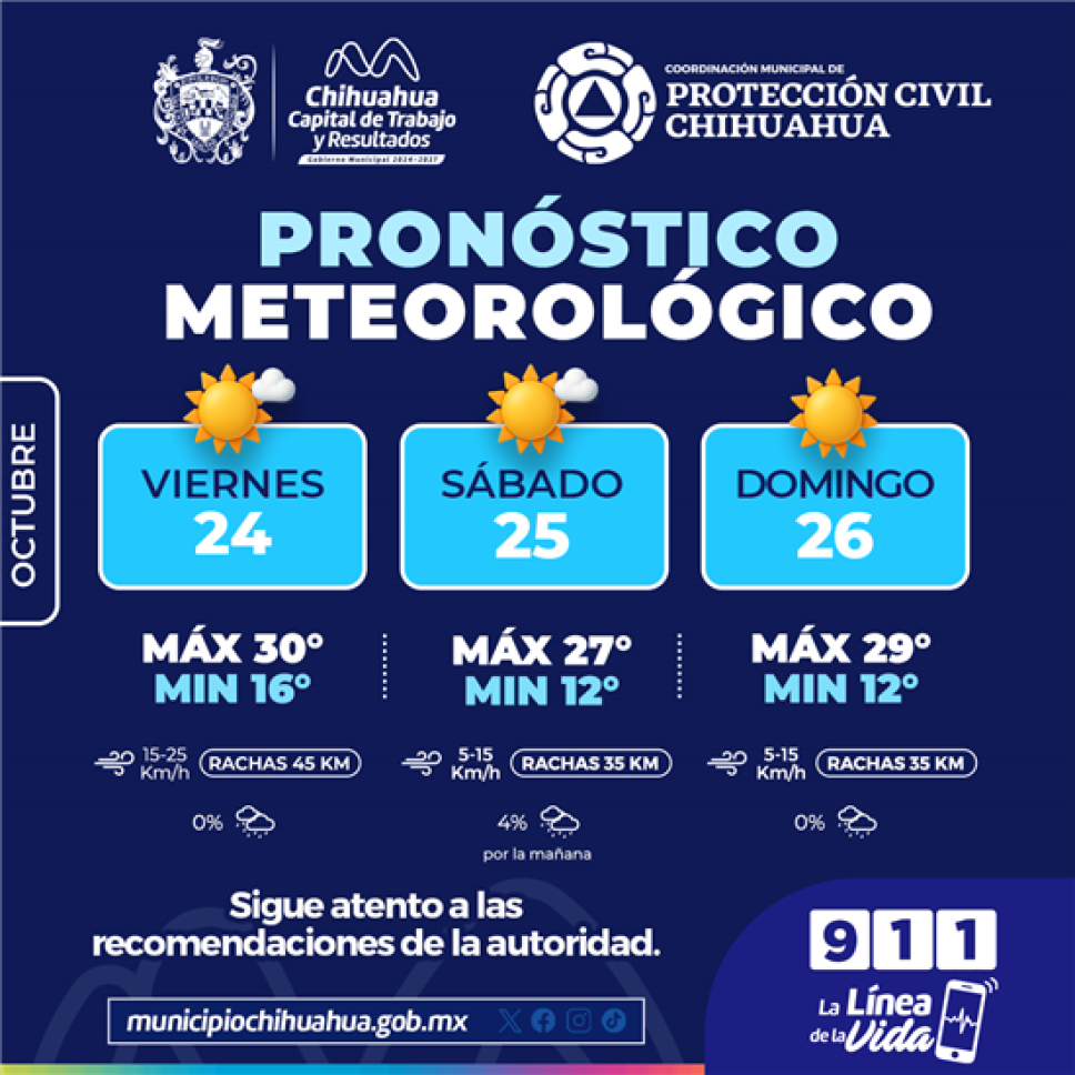 El Gobierno Municipal de Chihuahua, por medio de la Coordinación Municipal de Protección Civil, trae buenas noticias para el fin de semana. Se esperan condiciones meteorológicas agradables con predominio de sol y una muy baja probabilidad de lluvia, ideales para disfrutar de actividades al aire libre.