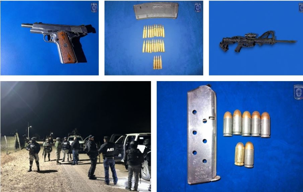 Asimismo, en el **municipio de Gran Morelos**, un operativo conjunto entre la Agencia Estatal de Investigación, la Secretaría de la Defensa Nacional y la Guardia Nacional resultó en el aseguramiento de dos armas de fuego y cartuchos percutidos.