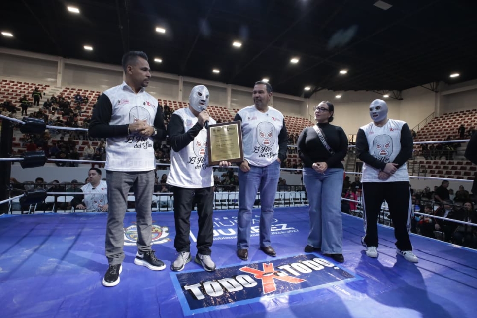 Antes de iniciar los encuentros, el alcalde entregó al ícono de la Lucha Libre una placa de reconocimiento por su destacada trayectoria. Pérez Cuéllar leyó el mensaje incluido en la placa, donde se resalta al Hijo del Santo como un referente indiscutible del deporte y se agradece que haya elegido a Ciudad Juárez como una de las plazas para cerrar su admirable carrera.