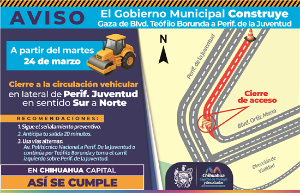 La Dirección de Obras Públicas del Gobierno Municipal informó que, como parte de los avances en la construcción de la Gaza de Incorporación en Teófilo Borunda y Periférico de la Juventud, se realizará un cierre estratégico en la lateral intermedia.