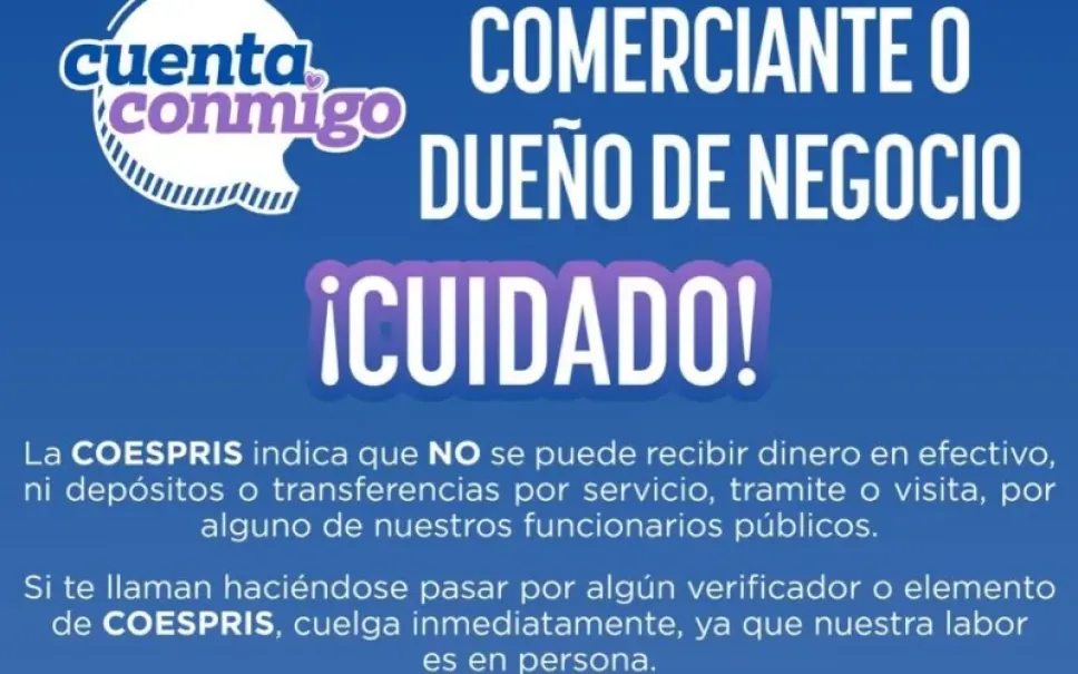 La dependencia estatal detectó que personas ajenas a Coespris se hacen pasar por inspectores para extorsionar a propietarios de establecimientos o particulares. Los falsos funcionarios solicitan depósitos o transferencias de dinero argumentando visitas de verificación sanitaria.