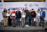 De manera simbólica, se otorgaron constancias a Jorge Medina, Itzel Baeza, Bania Adame, Derek Torres y Sofía Torres, en representación de todas y todos los participantes capacitados.