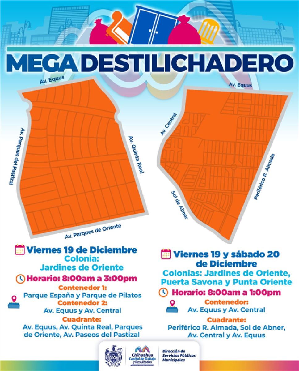 Durante el viernes 19 de diciembre se instalarán dos contenedores para la recolección de tiliches. El primero estará ubicado en la intersección de las calles Parque España y Parque de Pilatos, en la colonia Jardines de Oriente. El segundo se colocará en avenida Eqqus y avenida Central, para dar servicio a las colonias Puerta Savona y Punta Oriente. Ambos contenedores operarán en un horario de 8:00 de la mañana a 3:00 de la tarde.