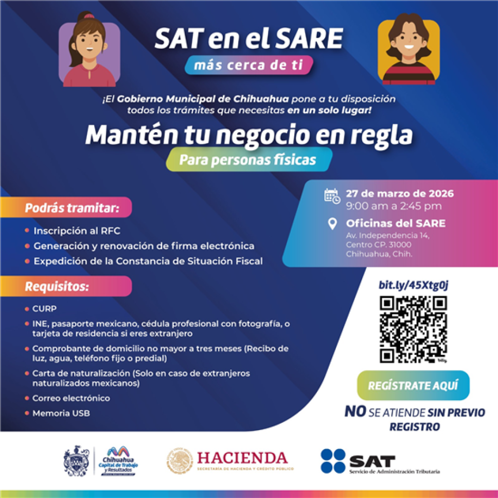Desde su implementación en 2021, este programa ha logrado agilizar la regularización de más de 670 contribuyentes en la capital. La próxima jornada se desarrollará en las oficinas del Sistema de Apertura Rápida de Empresas (SARE), ubicadas en la avenida Independencia, donde personal especializado brindará atención de 9:00 a 14:45 horas. Además de los servicios federales, los asistentes podrán recibir asesoría técnica sobre las licencias y permisos municipales necesarios para que sus comercios operen bajo el marco de la ley, fortaleciendo así la competitividad del sector productivo chihuahuense.