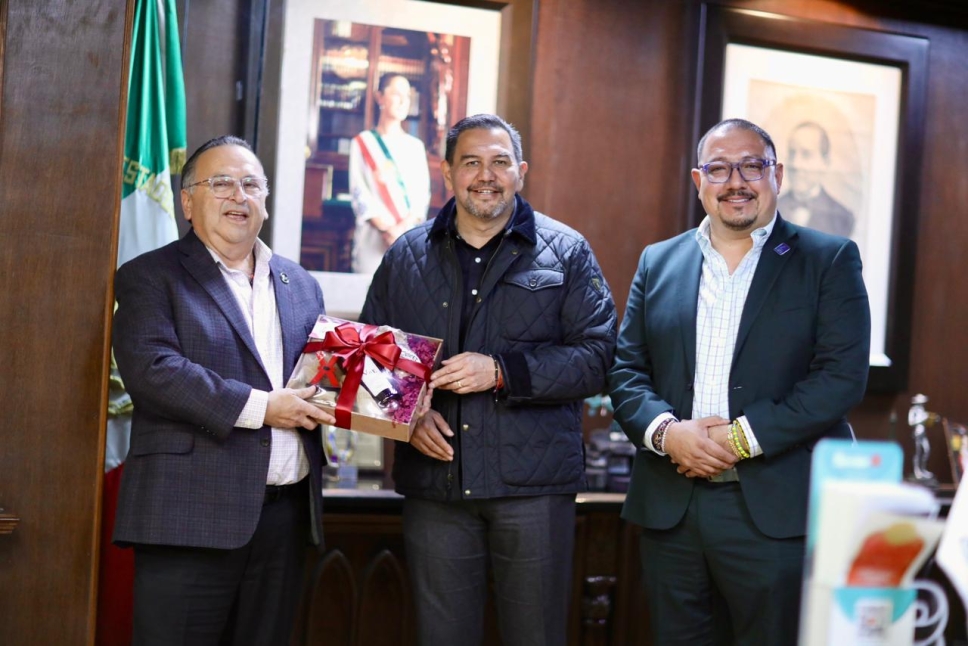 El alcalde Cruz Pérez Cuéllar recibió al presidente de la Cámara Nacional de Comercio de Tijuana (CANACO Tijuana), Olivaldo Paz Gómez, quien acudió acompañado por el presidente de CANACO Juárez, Iván Pérez Ruiz, para revisar los progresos de un convenio de colaboración entre ambas cámaras empresariales.