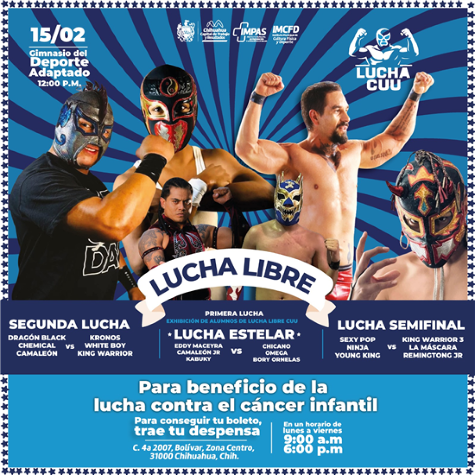 El Gobierno Municipal de Chihuahua, a través del Instituto Municipal de Prevención y Atención a la Salud (IMPAS) y el Instituto Municipal de Cultura Física y Deporte (IMCFD), recordó que este domingo 15 de febrero, a las 12:00 del mediodía, se llevará a cabo la gran función de Lucha Libre con causa en el Gimnasio del Deporte Adaptado.